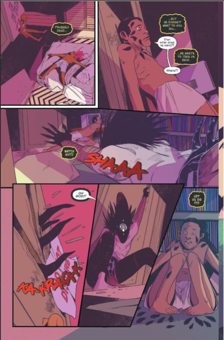 The creativity and imagination that we see throughout is horrifyingly brilliant and it really does give one the heebie jeebies. I’m loving the entire vibe that the book gives off and this has a lot to do with how we see the linework and it’s varying weights and techniques being utilised to create this crazy interesting attention to detail. I do wish we’d see more backgrounds utilised it’s the only thing this book is really missing. How we see the composition within the panels brings out the depth perception, sense of scale and the overall sense of size and scope of the story. The utilisation of the page layouts and how we see the angles and perspective in the panels show an extremely talented eye for storytelling. The various hues and tones within the story being utilsied to create the shading, highlights and shadow work shows a solid understanding of how colour works.