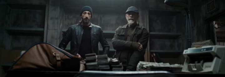This sounds promising. Trapped criminals and a foam drooling killer dog who loves to tear them into pieces. And a kingpin in a long black coat and leather gloves who’s waving dangerously with an automatic gun when he discovers that the three have accidentally found his money in this dilapidated building. Ultimately, this part of the film complements the most important theme. And that’s actually about these three robbers and their attitude towards animals. And also the mutual respect that can arise between humans and animals. Bullet Head is richly filled with dialogues between the three cornered robbers. The conversations between Adrien Brody and John Malkovich are entertaining. Especially the individual stories they tell each other are on the one hand hilarious and on the other hand very moving. The story of Malkovich and his tropical fish is extreme funny.
