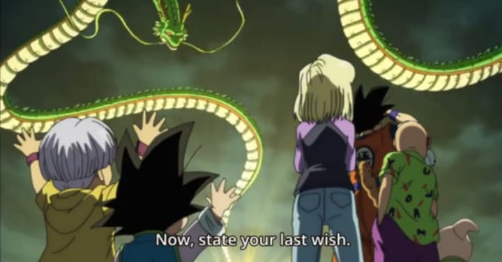 Most of last week's episode focused on several side characters attempting to have their wishes granted by Shenron. It was Goku who initially gathered the Dragon Balls to wish King Kai back to life through Shenron's wish but others started dropping in and requesting to have their own wishes granted, rather than reviving King Kai. Quite selfish to want to have their wishes for wanton desires granted when King Kai has been dead since the "Cell Saga". Luckily, Bulma arrived to save the day by granting everyone's wishes with her extensive bank account, giving everyone what they wished for. Bulma was even able to lend some heartwarming words to No.18 when No.18 had no idea of what kind of present Krillin would like.
