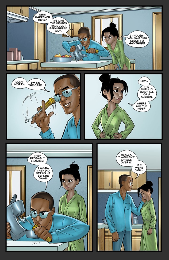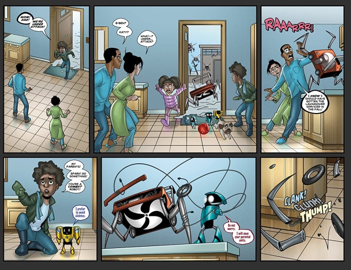 The interiors here are cute. I will say there are way too many blank background spaces in this book. This is a house and it would be nice if it felt lived in and full of furniture and such instead of just this nothingness but the characters themselves. This is my opinion but it really would enhance the story to utilise more backgrounds. The linework is strong and clean so that the detail in the bots is fantastic. The utilisation of the page layouts and how we see the angles and perspective in the panels show a solid eye for storytelling. The colour work is really rather nicely rendered. I like how the colours are utilised and when we see the various hues and tones within the colours utilised to create the shading, highlights and shadow work.