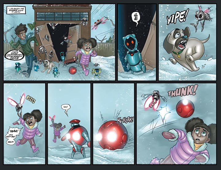 When two young siblings excitedly unwrap their final Christmas presents, they discover toy robots unlike anything they have ever seen. And with good reason. What the kids and their parents don't know is that their quaint suburban home just became the beachhead for these self-aware 'bots that have begun to explore the outside world. And when one of the 'bots breaks bad, it's going to take a Christmas miracle to stop him. In this concluding issue, the bots face off with the living room as their battleground.