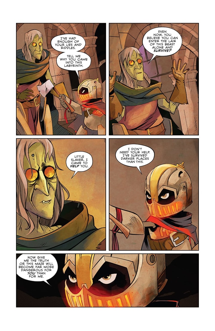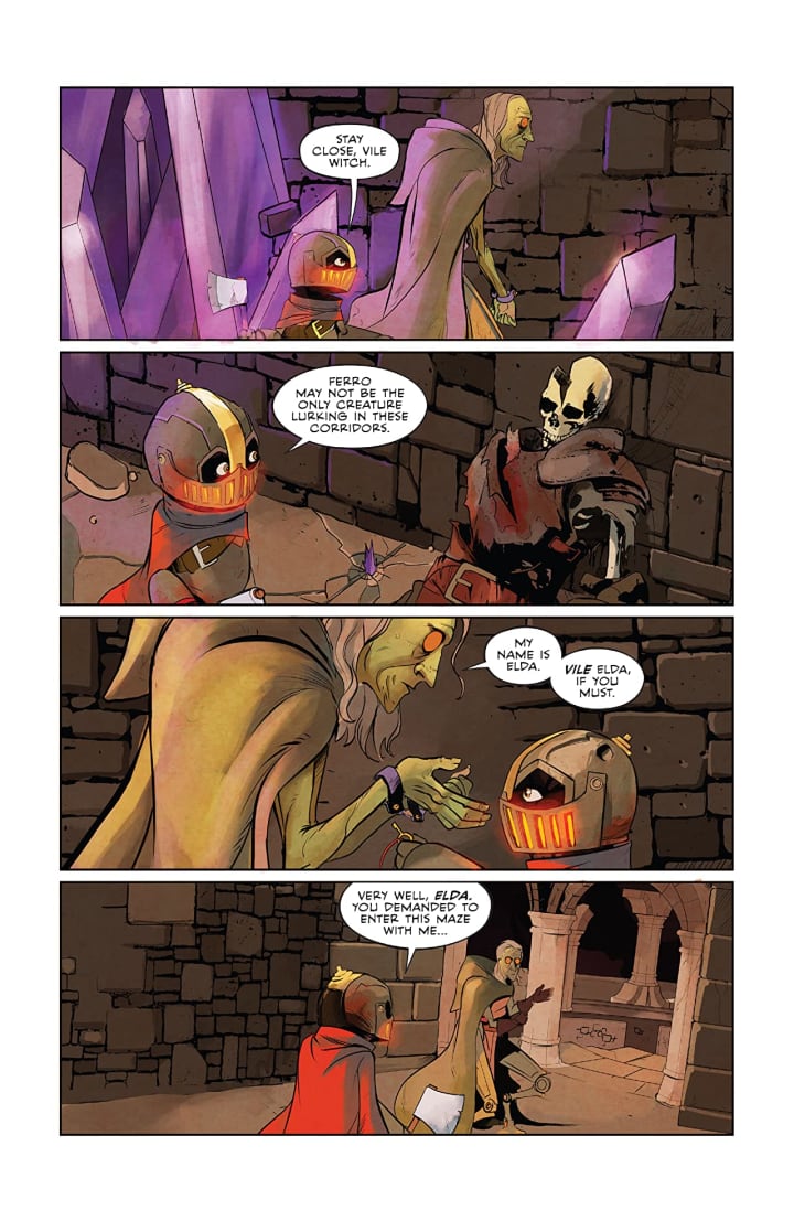 The interiors here are utterly delightful. I love seeing Sebastián’s take on Canto and the world that he lives in. the linework is really nice and how we see the varying weights and techniques being utilised to create the detail work is extraordinary to see. These two-page spreads with the maze built out of rock are truly spectacular to see. How we see the composition within the panels being utilised to create the depth perception, sense of scale and the overall sense of size and scope to the story is achieved beautifully. The utilisation of the page layouts and how we see the angles and perspective in the panels show a remarkably talented eye for storytelling. The creativity and imagination is beautifully showcased throughout the book and with Ferro especially. The colour work is absolutely spectacular. The various hues and tones within the colours being utilised to create the shading, highlights and shadow work shows a great eye for colour and how to utilise it. The magic effects and the fire within Canto and his friends we see in the Burgonet are also some really stand out moments.