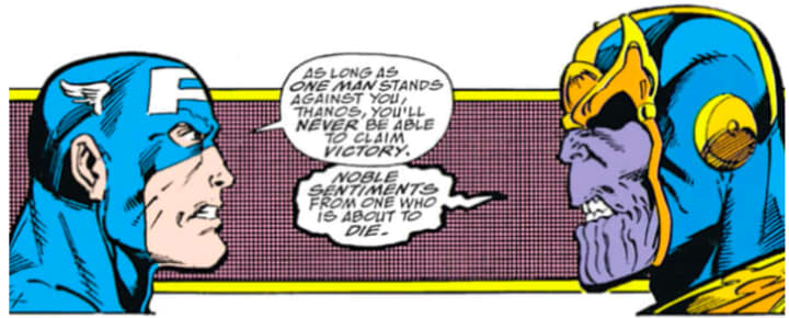 For many, this is the quintessential Captain America scene; the moment when the hero stands against impossible odds, refusing to bend, refusing to break. It's the moment that defines Captain America — and though he survived it in the comics, will the same be true in the films? Will his death at Thanos's hands be the inspiration that brings victory?