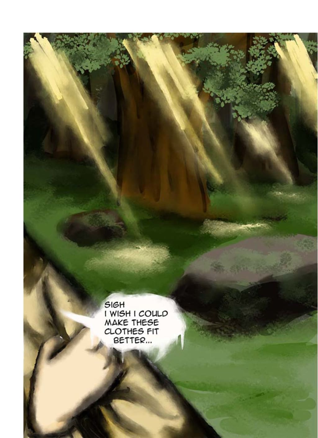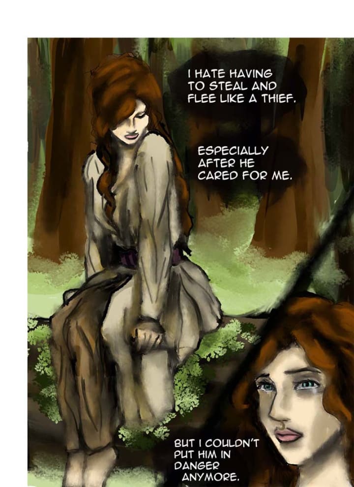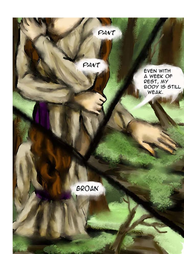 With a groan she sat down on a fallen log, panting heavily from exhaustion. Though the external wounds had mostly healed, her bruised ribs and weak muscles wouldn’t allow her to go as far as she wanted.