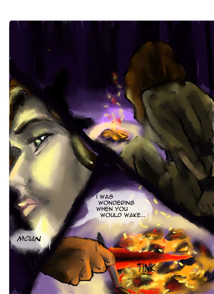 When she came to, it was twilight and a foul smell filled her nose. “I was wondering when you would wake up.” The man mused as he sat near a low fire, turning a red hot blade in the coals. Klara coughed heavily. “Burning oregano, always seems to affect your kind.”