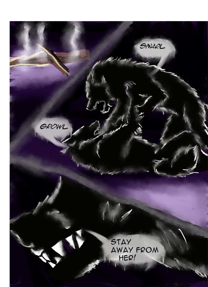 One of the wolves grabbed the other, saying, “Stay away from her!”, before sending him flying into a thick tree where he lay motionless on the ground. It then turned to her and she cried softly, drawing back in fear only to have the chains tighten and scrape her skin.