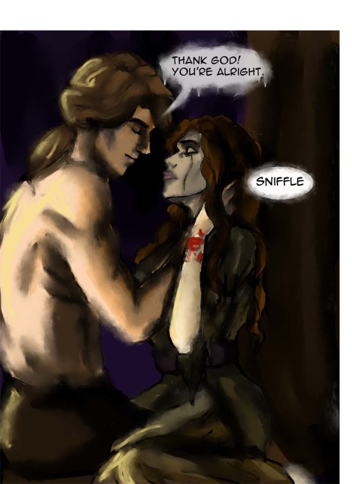 “Thank God, you’re alright.” he breathed. Klara couldn’t believe it. He’d come for her. He’d shown his other form to her without hesitation. What could this mean? Did he feel something for her? All these questions swirled in her tired mind but she wasn’t able to focus on them. There was only one thing she could think of and she started crying heavily.