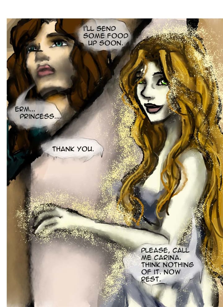 “There, all done.” Carina panted, wiping her sweaty brow. Klara opened her eyes and was astonished to see nothing left of the burns on her wrists. “Now, I want you to rest for a good while. I’ll send some good food to your room in a bit.” She rose gracefully and started to leave.