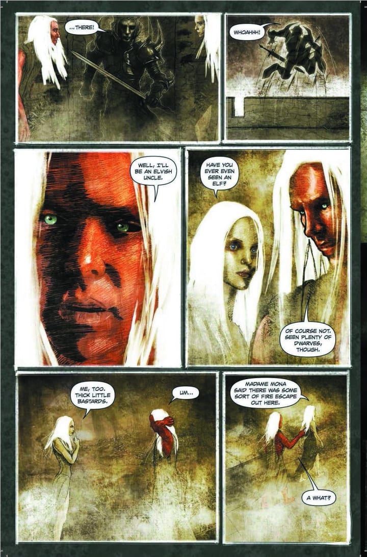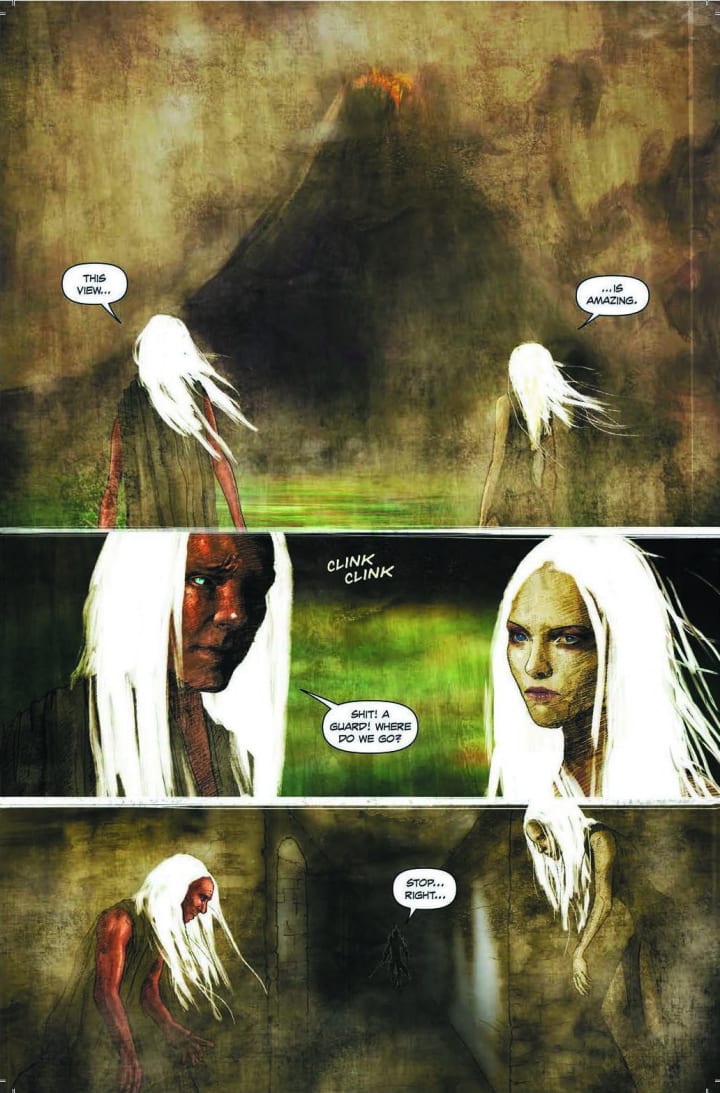 This is amazing interesting to see unfold. There is something that borders on erotic with what we see throughout the book as our two heroes, for lack of a better term, are out trying to get to their destination. I mean I’m sorry but the outside of the castle has a very phallic look and feel to it. I am also pretty impressed with the way that Denton is writing this as he’s not wasting any time with how the story progresses while still leaving enough open for the reader to become more fully engaged and wonder/think/speculate on what it is they are seeing. Plus there is some levity to what we see as well, “well, i’ll be an Elvish uncle” yeah that made me crack a smile with a silent giggle.