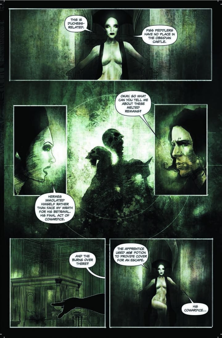 Damn Menton3 and his god given talent. The white hair, or absence of colour, against such a dark and dreary background is startling. The man’s face on page two is something I may see in my nightmares and all the phallic symbols yeah wow it all conspires to really create this hypnotic and mesmerising effect. I know this is painted but it feels like there’s more than that going on here and you could simply get lost for hours staring at page after page and never get bored. Sometimes it takes me longer to read this because i’m so wrapped up in seeing how utterly gorgeous this work is. The composition within the panels and how they serve to bring us depth perception, a sense of scale and the overall sense of size and scope to the story is marvellously rendered. The utilisation of the page layouts and how we see the angles and perspective in the panels show an incredibly masterful eye for storytelling. The colours, good lord the colour work is divine. How we see the various hues and tones within the colours being utilised to create the shading, highlights and shadow work is extraordinary.