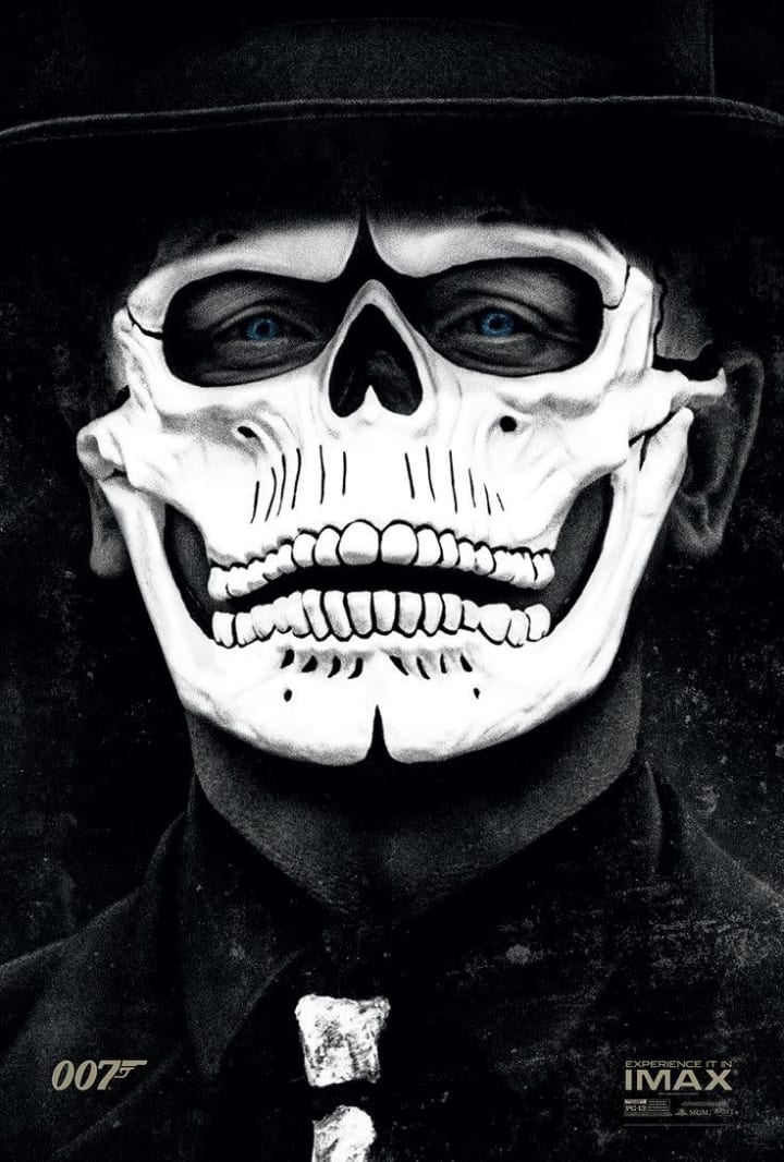 Following the spectacular critical and audience reception of Skyfall, the 24th installment of the #Bond franchise was incredibly anticipated. This Day Of The Dead-inspired poster featured a close up of 007 (#DanielCraig) wearing a skull mask — dashing blue eyes revealed — among a sea of charcoal black and white accents highlighting his features. Theories and speculations arose, of course, with fans wondering what the imagery could possibly mean.