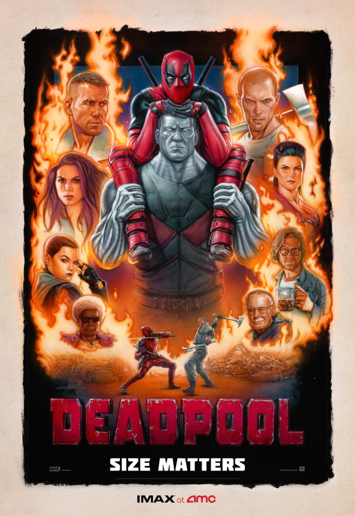 According to this Deadpool poster, size does matter and if there is anything we learned from the foul-mouth antihero, he is never wrong. This awesomely illustrated poster features all of our favorite characters including Deadpool (#RyanReynolds) hanging out on Colossus's (Stefan Kapičić) shoulders, Ajax (Ed Skrein) grasping an ax and a random #StanLee cameo on the bottom right.