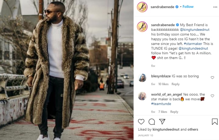 Sandra has amassed over two hundred and twenty five THOUSAND followers on Instagram alone. She has become friends with one of the biggest celebrity bloggers in Nigeria, Tunde Ednut, who regularly shares her posts to his millions of followers. When his account was suspended and he had to start from scratch and get another one, Sandra made it a point to share about it so that people would follow his page. She’s doing all of these things to continue to remain in Tunde’s good graces because as we all know, Tunde is definitely someone whose endorsement of a contestant on the show carries a lot of weight and gets voters voting.