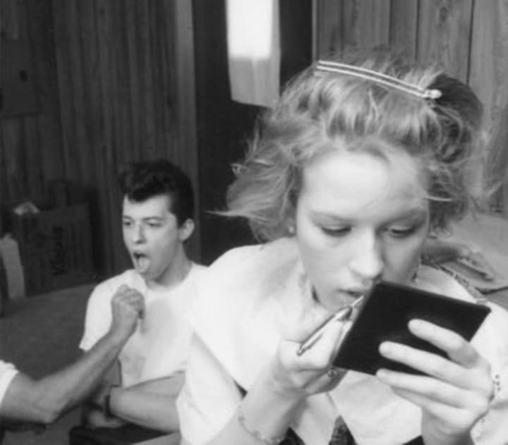 This image just screams '80s with Molly Ringwald delicately putting on her lip gloss while Cryer (as Duckie Dale) waits patiently and rocks that iconic hair.