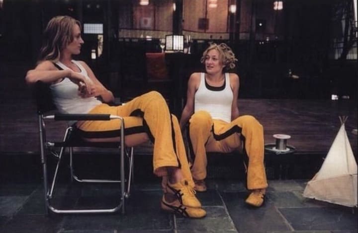 Seeing actors with their stunt doubles is a lovely thing. Here we see Bell and Thurman both rocking those iconic yellow pants on set of Tarantino's Kill Bill.