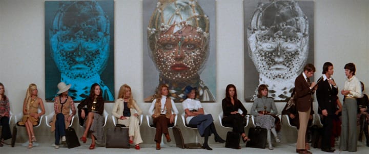 This scene is perfect, it sets the world and the challenges facing Bree and forces you to confront her as more than just a sex worker. Bree is a woman with goals and dreams in a cruel world that appears to just want one thing from her. The set design in this scene is gorgeous, elaborate and massive. A striking set of paintings of a woman made up like a robot or an alien, hang over the women as they are assessed and whether they mean something or not isn’t as interesting as their beauty. That in itself, underlines the point about beauty as a commodity.
