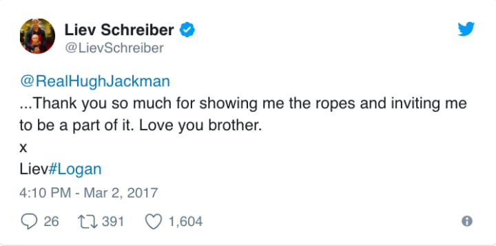 Schreiber's emotional tweet thanks Jackman for his help on the set. Although Schreiber only appeared in Origins, his ending left it open for a return, while Sabretooth as a character features heavily in the #comicbook universe of X-Men.