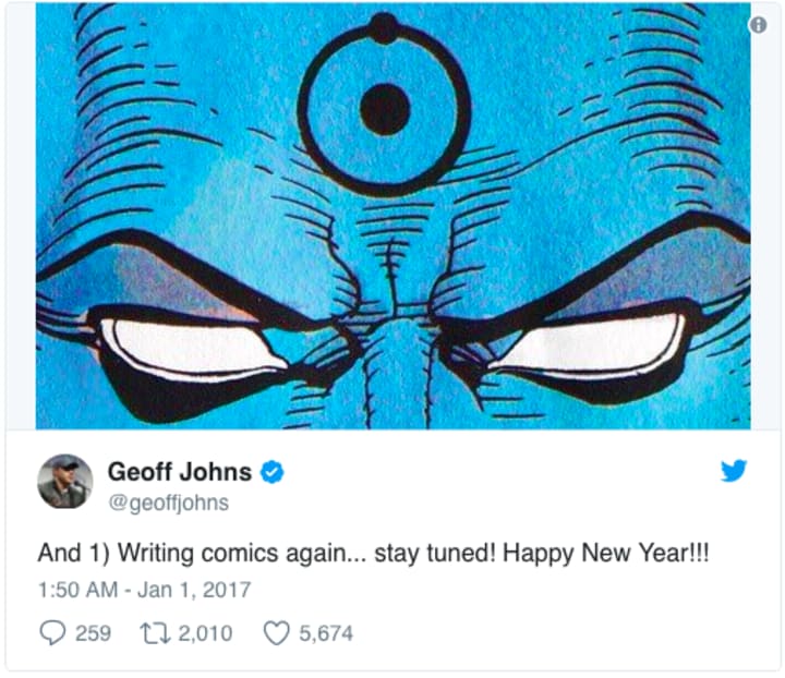 This tweet is tremendously exciting, not just because Johns is returning to the comics, but because he included an image of Doctor Manhattan, a character from Watchmen. That suggests that 2017 will see Geoff Johns return to progress the overarching narrative he launched last year, and I for one couldn't be more excited!