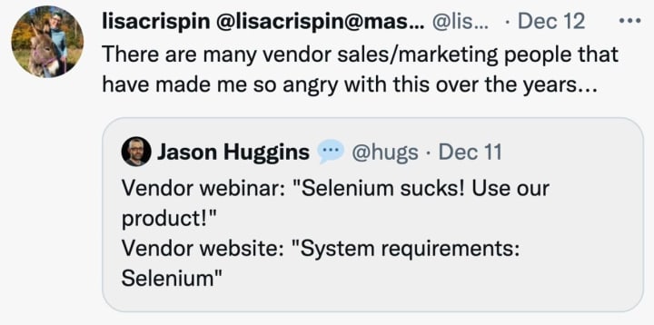 I share the same feeling: ‘Angry’ as Lisa Crispin (author of the classic ‘Agile Testing’ book) when people throw evil mudslingings to Selenium for commercial reasons (Selenium is 100% free and open-source), over the years.