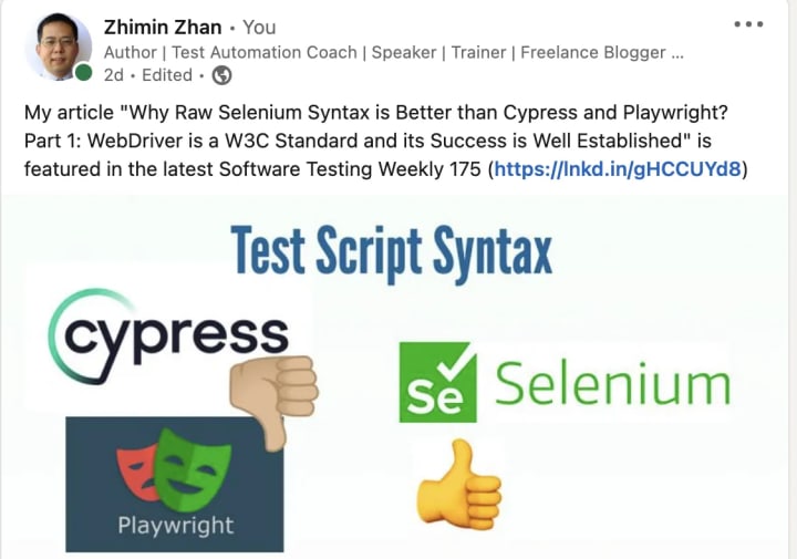 I wrote my article on my personal blogger and posted “It is featured in a reputable software testing newsletter” (i.e. was selected by a reputable curator who at least consented with professionalism). Even that, I received this personal attack. Suddenly, I could relate to the “Cypress Soviet propaganda” phrase in that Reddit post. My article refers to both Cypress and Playwright, also, I have made accurate predictions regarding the failures of Phantom.JS, Protractor.js, Cucumber, and several other tools. These opinions are purely technical in nature and should not be subjected to personal attacks, regardless of their accuracy. I have never received such verbal abuse from others. See, there is a difference.