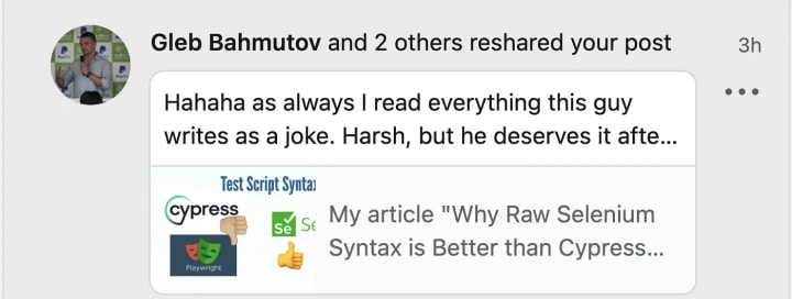 Gleb (Distinguished Engineer at Cypress.io, an authority on Cypress) reshared with a comment, calling “everything I wrote (you are reading or have read) is a joke”. That’s unprofessional at least, right?