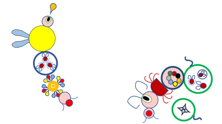 Imagine a race of beings with no vocal cords and fairly weak vision. This is where I got the idea to experiment with a taste-based language. That’s right, the “speakers” are multi-limbed eight-headed beings who spit little coloured packets filled with organic flavour compounds into each others’ mouths. The packets are eaten and the sequences of chemical flavours are interpreted as words and sentences by the “listeners”. Other races on their world call them "vomit eaters" but the term is now considered derogatory.