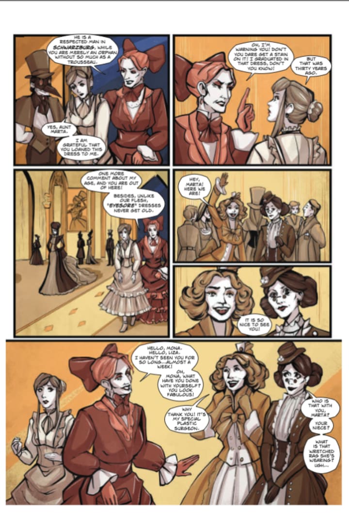 The interiors here are really well done. The creativity and imagination that we see throughout, particularly in Ronald and the designs he does are beautifully rendered. The linework is strong, crisp and clean and how we see the varying weights and techniques being utilised to create the detail within the work is exceptional. The fact that there’s a tinge of manga influence in the work interests me with how we see this as well. I do wish we’d see more backgrounds in use for when we do they enhance and expand the moments nicely. How we see the composition of the panels brings out the depth perception, sense of scale and the overall sense of size and scope to the story. The utilisation of the page layouts and how we see the angles and perspective in the panels show an extremely talented eye for storytelling. This is a version of a black & white coloured book, the base colour changes but it’s the various hues and tones within the base colour that are utilised to create the shading, highlights and shadow work and it’s extremely well achieved. I’m impressed with how we see the various sections and how they are brought to life.