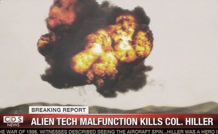 While test piloting the ESD’s first alien hybrid fighter, an unknown malfunction causes the untimely death of Col. Hiller. Hiller’s valor in the War of ‘96 made him a beloved global icon whose selfless assault against the alien mothership lead directly to the enemy’s defeat. He is survived by his wife Jasmine and son Dylan.
