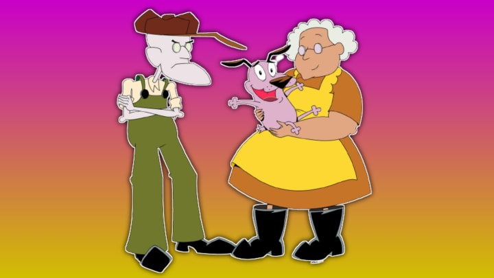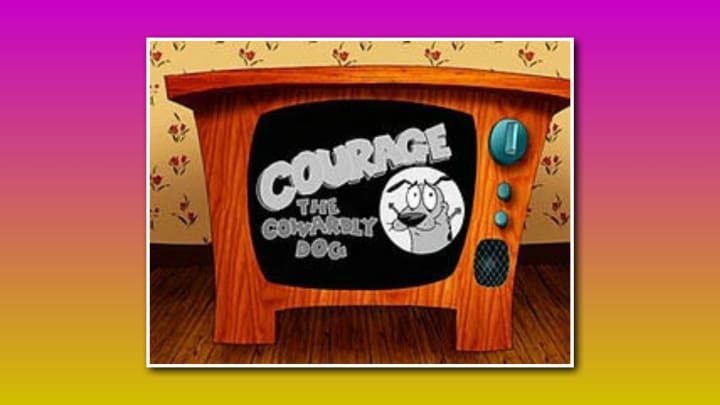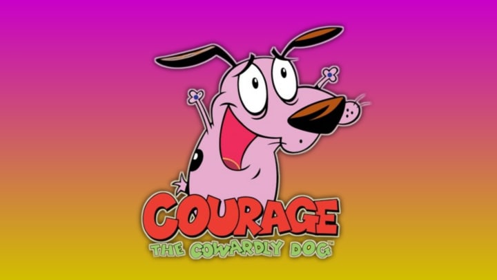 Courage is the main character of an animated TV show that aired on Cartoon Network in the late 1990s and early 2000s. He is a small pink dog with a yellow shirt who lives with his elderly owners in a farmhouse in the middle of Nowhere. Despite his name, Courage often overcomes his fears to protect his owners from various supernatural threats.