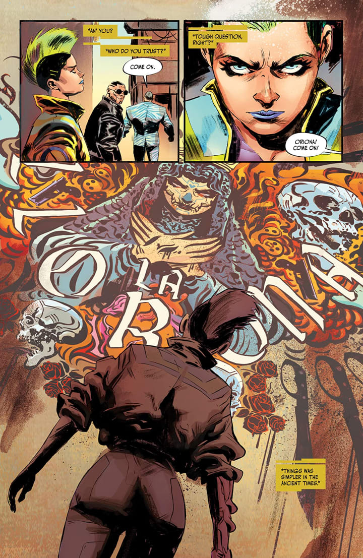 The interiors here are gorgeous! Right off the bat when we see the mural that is both impressive and scary as hell at the same time you know the whole issue is going to be something amazing. The linework is phenomenal and how we see the varying weights and techniques being utilised to create the detail work is beautifully rendered. I’m a huge backgrounds kind of guy and what we see here is great and how they are utilised in the composition within the panels to create the depth perception, sense of scale and the overall sense of size and scope of the story. The utilisation of the page layouts and how we see the angles and perspective in the panels show a sensational eye for storytelling. The colour work is absolutely stunning. Not only are the various hues and tones within the colours being utilised to create the shading, highlights and shadow work is rendered to such perfection. That jacket we see change colours is a wow factor regardless of which colours were utilised as a complete and utter surprise.