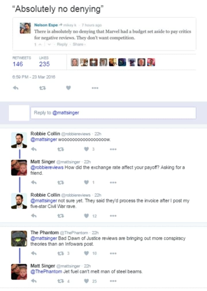 Amidst the threats, swear words, disillusionment and tears there are also the conspiracy theories; one wild accusation is that the critics have been paid by Disney/Marvel, to deliberately trash the reputation of this tent pole release from DC/Warner Bros. to further their own prominence.