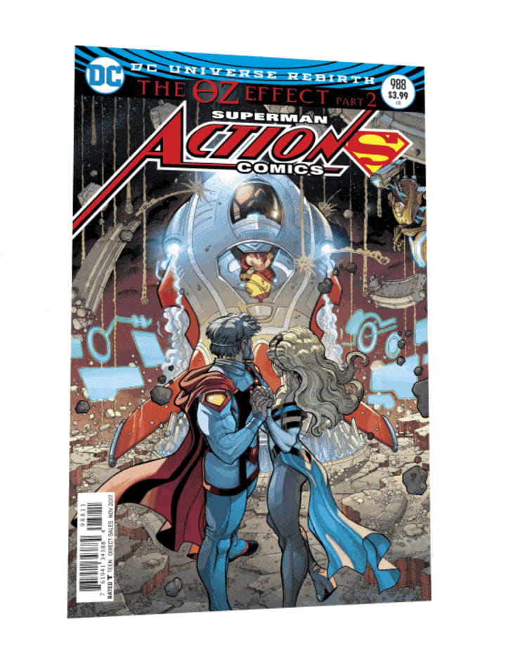 That's a variant for Action Comics #988, the second part of "The Oz Effect." The first image clearly shows a moment that's familiar to all fans of the Man of Steel; the moment his parents put their infant in a rocket, sending him to Earth in order to save him from Krypton's destruction. The second image, though, shows a very different scene; it appears to show Jor-El, Superman's father, snatched out of time and space by an energy-effect we'd traditionally associate with Dr. Manhattan, the #Watchmen character who's the main villain of DC's "Rebirth" initiative.