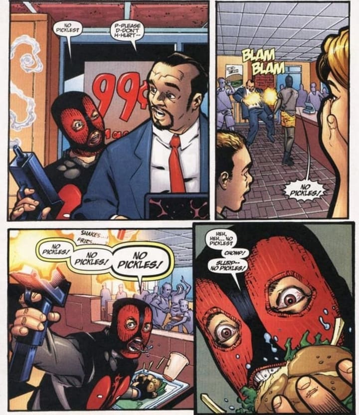Deadpool has died before (twice actually). After the second time, he was resurrected by Thanos, but not before four false Deadpools could appear in the Marvel Universe. Each of the four Deadpools was a personification of the various aspects of his personality, as a parody of DC's famous Death of Superman. The first was an idealistic hero with traditional heroic elements, the second was a Punisher-esque fighter who took pleasure in killing anything; the third was a pop culture star similar to Bam Margera; and the fourth Deadpool was completely insane, saying only two words the entire arc: "No Pickles."