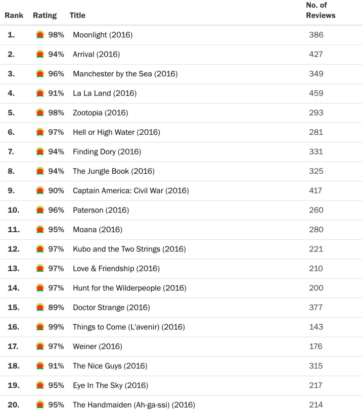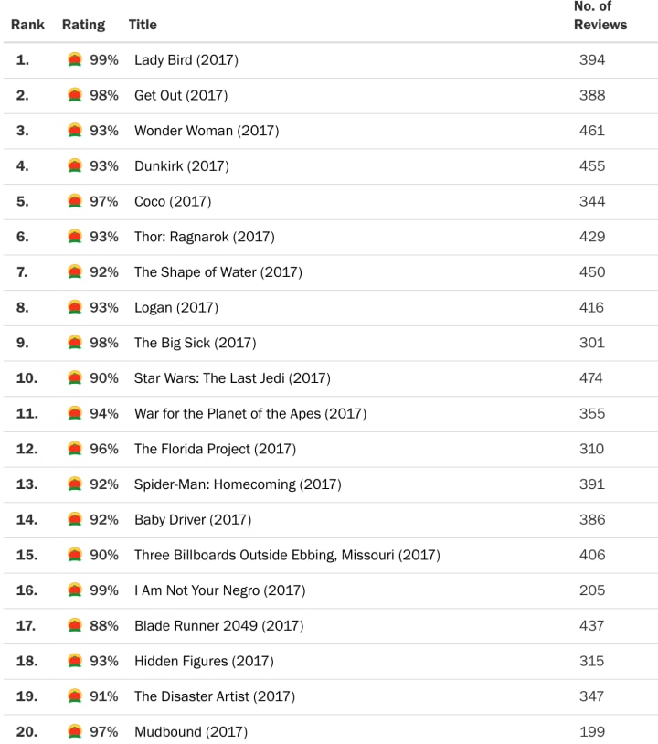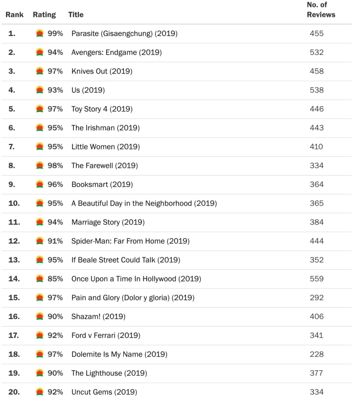 Looking at the films eligible for the 2020 Oscars from the 2019 and 2020 lists shows Parasite came out on top with a score of 99%, followed by a somewhat understandable snub for Portrait of a Lady on Fire, which I have not been able to watch but understand is a very original and affecting piece, a slightly disappointing brush-off of Knives Out, an applaudable rejection for Avengers: Endgame and a relatively weak score of 89% for 1917.