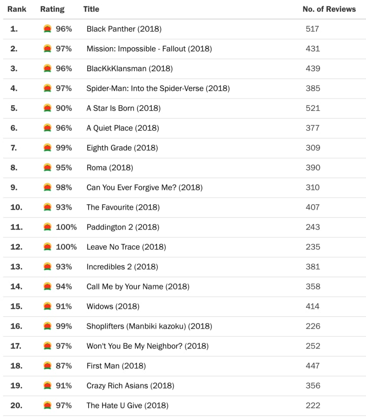 Going to Rotten Tomatoes, we see two frontrunners who might have been nominated if a few more of those Old Academy members had made their way to the In Memoriam section; Mission Impossible: Fallout and Spiderman: Into the Spider-Verse. The former was a franchise rejuvenating action spectacle directed by great Twitter follow Christopher McQuarrie and the latter was a creative work of collaborative genius with a unique visual aesthetic and storytelling flow that will certainly be studied for generations of animators to come. And they both have colons in them, who doesn't love punctuation it their titles!