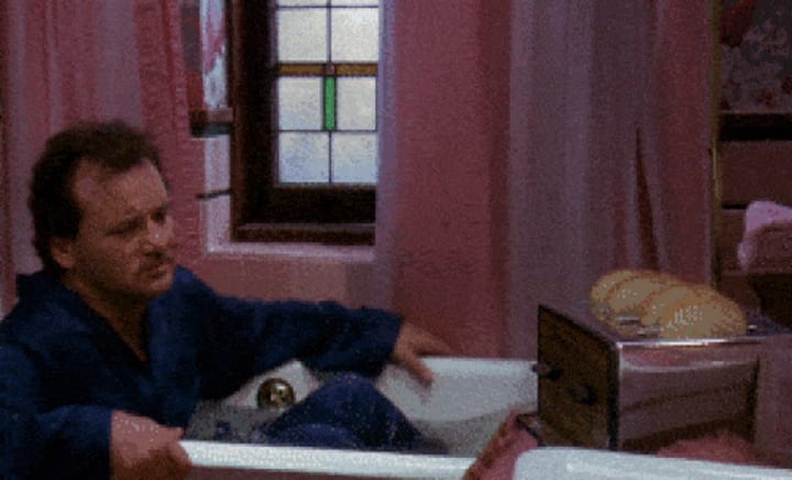 Phil spends his evening avoiding his co-workers and drinking far too much. So, woozy from the boozing, and frozen to the bone from a day at the mercy of the elements, the theory goes that when Phil jumps out of the bath from his ice shower, he actually takes a spill and hits his head. The cocktail of alcohol and low body temperature puts him into a permanent coma, playing out for the rest of his days as a never-ending Groundhog Day. If you remember, we never see Phil actually go to bed, or set the alarm. The last we see of him is him wandering the halls in a fluffy gown moaning about the water, then BAM, we just jump-cut to 6am and the soothing tones of "I Got You Babe." Phil never actually went to bed and his body is still there on the bathroom floor!
