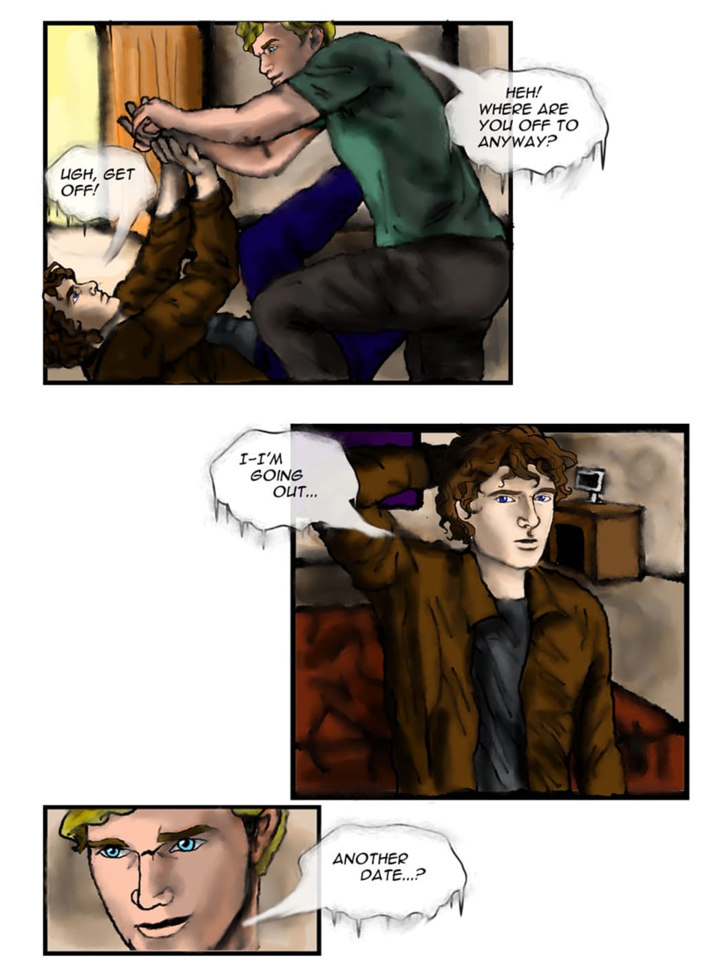 “Get off!” Jacob grunted with annoyance. Colin continued to laugh as he threw his coat on the floor. “Where are you off to anyway?”