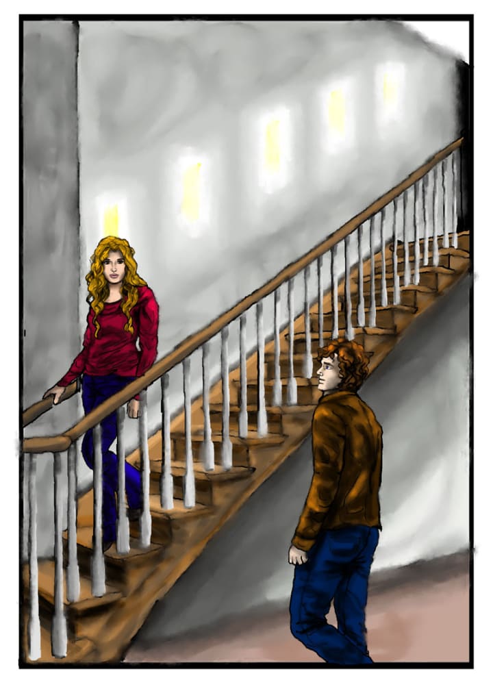 “Sorry about that,” came a giggle from the stairs. Jacob instantly felt his energy spike yet again as Rebecca came down the steps. “Penny is very protective of me.” He was taken aback by her beauty and could only stare for a long moment. Her long golden hair fell in elegant curls around her face and she wore a well fitting red sweater and dark sweatpants. Her face was lit up by her smile and her brown eyes were shining with excitement.
