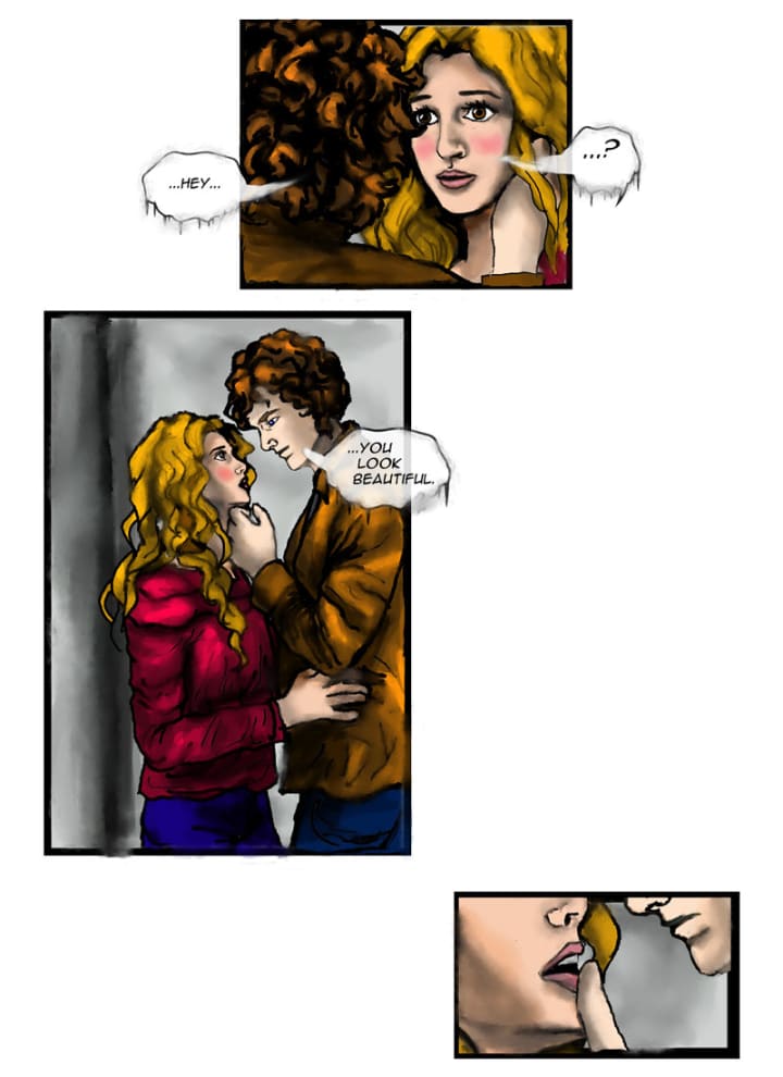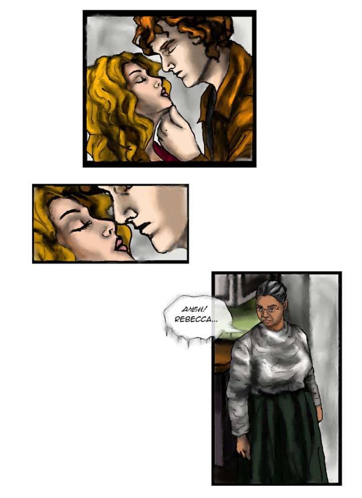 “You look beautiful.” She blushed. Almost without thought, he leaned in to kiss her… Then the old woman came back from the other room and cleared her throat. Jacob and Rebecca froze.