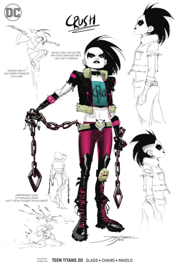 The buzz on ol’ Crush began in the spring of 2018, when it was announced (in the weeks prior to the release of her first appearance in Teen Titans#20) that she was the daughter of DC’s intergalactic bounty hunter Lobo. The popularity of Lobo back in the 1990s was absolutely bonkers. So, many of the “Main Man’s,” longtime fans were stoked to see a spunky offspring following in the footsteps of her dad’s punk rock style boots.