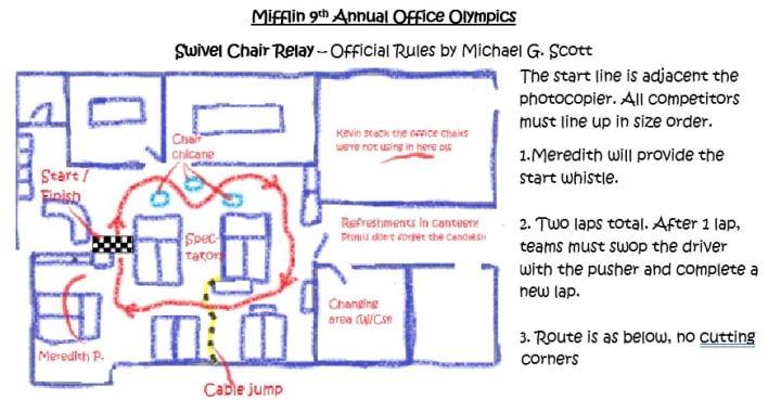 Pam, we have the office Olympics tomorrow. I’m busy writing the rules for the swivel chair relay today. I’ll need you to do it.