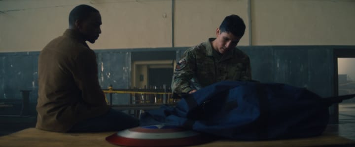 During the episode's opening fight, Sam's Falcon suit is seriously damaged by Walker. While he chooses to take the shield home with him, Sam leaves the broken wings with Joaquin Torres, who has served as his military contact throughout the series.