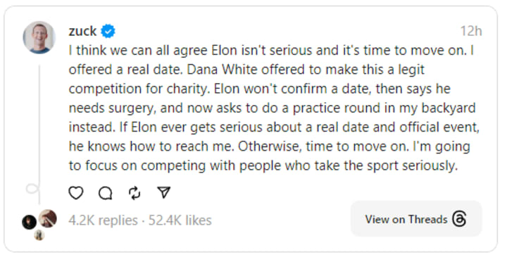 Zuckerberg conveyed that there appears to be a consensus that Elon Musk's initial proposal lacks a genuine intent, necessitating a transition to more substantive matters. He highlighted his proactive efforts to propose a concrete date for the event and underscored that Dana White had extended an offer to transform it into a credible charitable competition. However, he observed that Elon Musk has not confirmed a specific date, citing medical reasons and subsequently suggesting a preliminary practice round at Zuckerberg's residence.