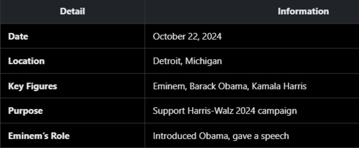 Reply: On October 22, 2024, Eminem presented Barack Obama at a Detroit rally for Kamala Harris and Tim Walz. He talked almost securing flexibilities and embraced Harris's vision for America.
