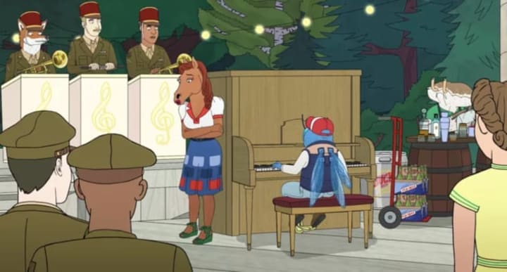 - The only thing better than the flashbacks themselves is the way they're artfully blended into the modern-day story. The fading back and forth between time periods, with music seamlessly framing the flowing parallels. Paul Giamatti sings the Horsin' Around theme song before Bojack's phone rings, playing a ringtone of the same song. Special mention goes to Ed the dragonfly and Honey dueting on the song she and Crackerjack played... 60 years apart. In a show full of well-done episodes, The Old Sugarman Place in particular makes the most out of its animated format, using the medium for some truly beautiful filmmaking and storytelling.