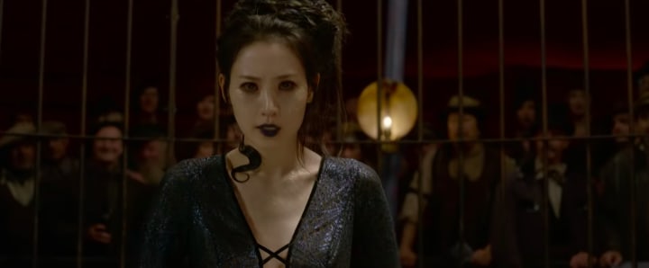 Here is the HUGE twist that most of us didn't see coming. For the past few months, we've known that Claudia Kim is going to have a role in the film, but she was known only as an "unidentified Maledictus." However, in this trailer, it is revealed that her character is actually NAGINI!!!