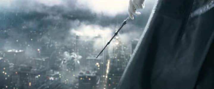 We get a shot of the Elder Wand here. Now, in 1927, which is when this movie takes place, the wand was wielded by Grindelwald, so he is the one holding the wand over the city in this shot.