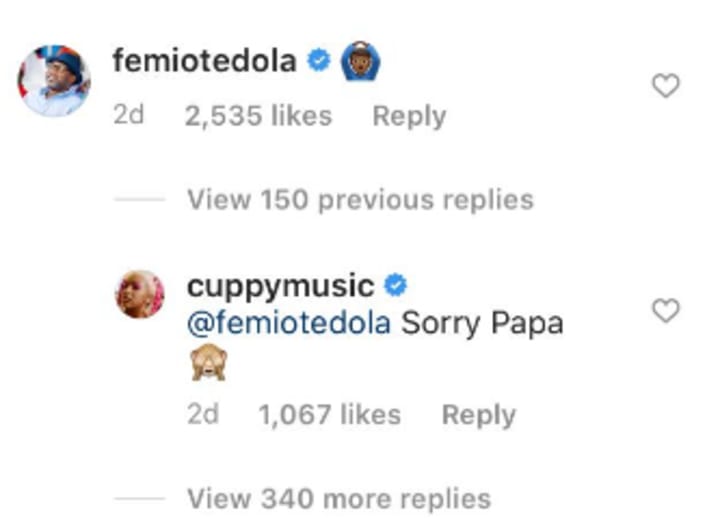 Eventually DJ Cuppy herself saw her father’s reaction and said simply “Sorry papa” with a shy monkey emoji covering it’s face.