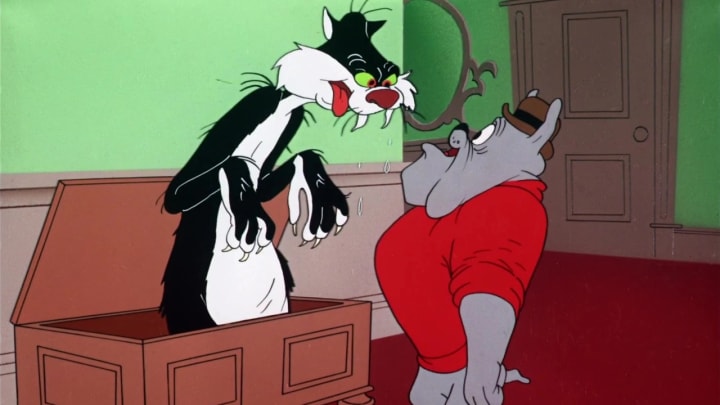 The first of the shorts was Dr. Jerkyl's Hide, which came out on May 8, 1954. This was the second and final short to feature the obscure canine duo of Spike and Chester, with Sylvester being featured as well. Though this is a near bit-by-bit copycat of Spike and Chester's first short, Tree for Two, there are a few differences. For one, the setting was England. Secondly, the canines were given Cockney accents, and thirdly, Spike's name was changed to the more British-sounding Alfie.
