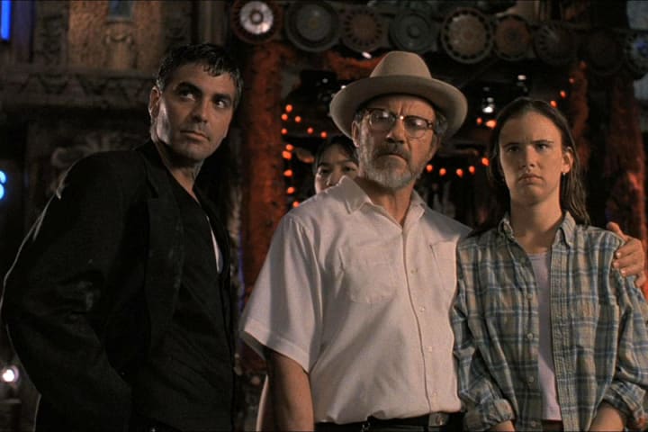 This compelling twist of a movie is led by a great cast. Quentin Tarantino, who is also the film’s screenplay writer does a great job in the actor’s chair as Richard “Richie” Gecko, the loose cannon and schizophrenic youngest of the Gecko brothers, who is responsible for much of the conflict in the film’s plot. Frequent Tarantino collaborator, Harvey Keitel displays a great sense of versatility and range as Jacob Fuller, a rather passive minister who struggles with a loss of faith in the aftermath of his wife’s death. What makes this third collaboration between Keitel and Tarantino so interesting is how far removed this role is from Keitel’s tough guy roles in his previous Tarantino projects. The roles of Kate and Scott Fuller are portrayed by Juliette Lewis and Ernest Liu, respectively. In her role as Kate Fuller, Juliette Lewis personifies a great sense of young ingenue leading lady quality. It goes without question that the most captivating performance of the film was George Clooney as Seth Gecko. As this leading character, Clooney was a perfect mix of vicious tough guy and sophisticated anti hero all wrapped in one body. Many people credit Clooney’s role in this film for solidifying his status on the big screen. I can honestly say this was the movie that made me a big George Clooney fan.
